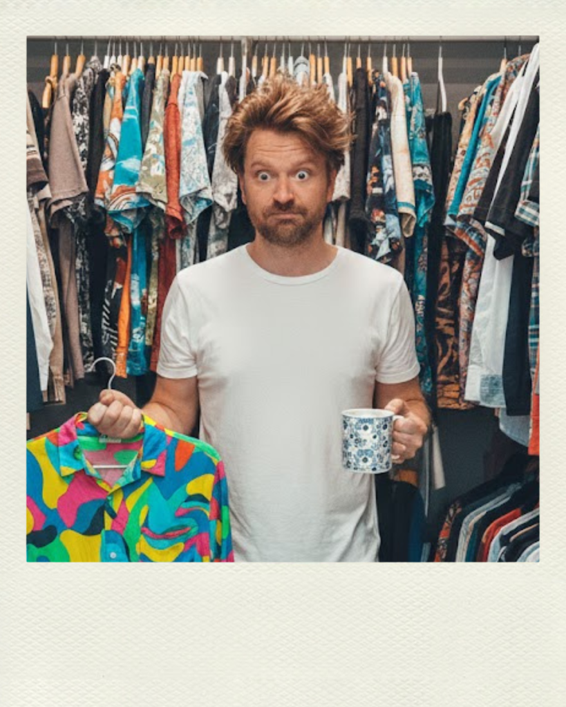 Option C: Or the chaotic combo — a graphic tee (likely a Rinna meme) under a sharp jacket, slim dark denim, and the kind of aggressively affectionate energy that says I can’t decide between suave and ready to hug someone I just met.
